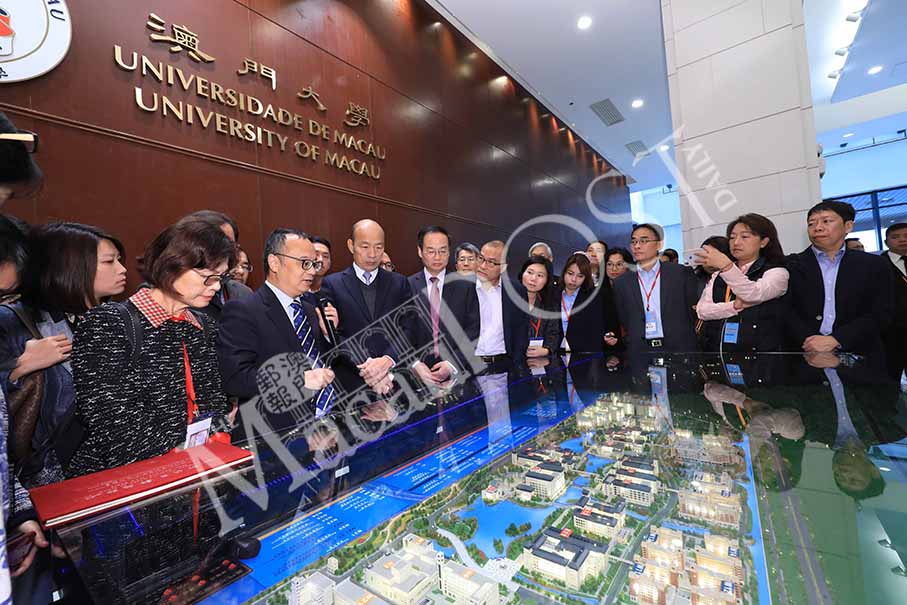 University of Macau (UM) Rector Song Yonghua (second from left) briefs Kaohsiung Mayor Daniel Han Kuo-yu (third from left) and his delegation about the public university on the UM campus yesterday. Photo UM