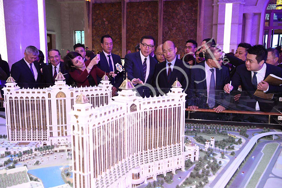 This handout photo from Galaxy Entertainment Group’s (GEG) Public Relations Senior Vice President Buddy Lam Chi Seng’s social media account shows the gaming operator’s Deputy Chairman and CEO Francis Lui Yiu-tung (fifth from left) showing Kaohsiung Mayor Han Kuo-yu (third from right) a model of GEG’s Galaxy Macau integrated resort during Han’s visit to the property in Cotai on Saturday.