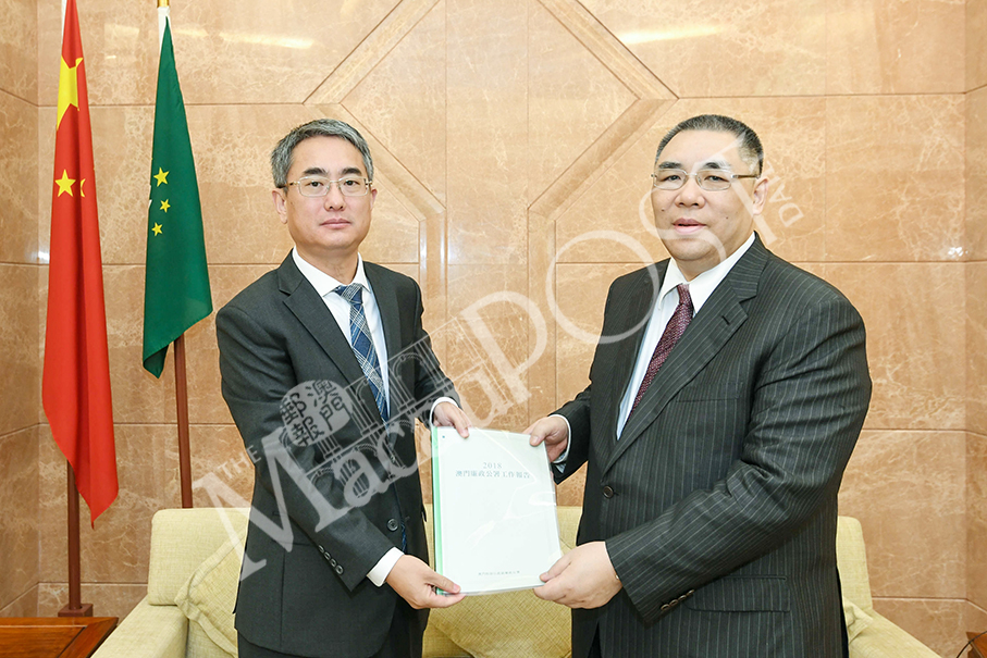 This undated handout photo released by the anti-graft body yesterday shows Commissioner Against Corruption (CCAC) André Cheong Weng Chon (left) handing his 2018 Annual Report to Chief Executive Fernando Chui Sai On. The anti-graft body did not reveal the venue where Cheong submitted the report to Chui.