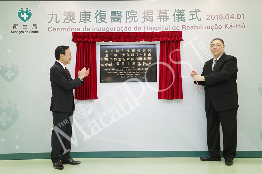 Chief Executive Fernando Chui Sai On (right) unveils the new Ka Ho Rehabilitation Hospital inaugural plaque, as Secretary for Social Affairs and Culture Alexis Tam Chon Weng applauds. Photo: Health Bureau