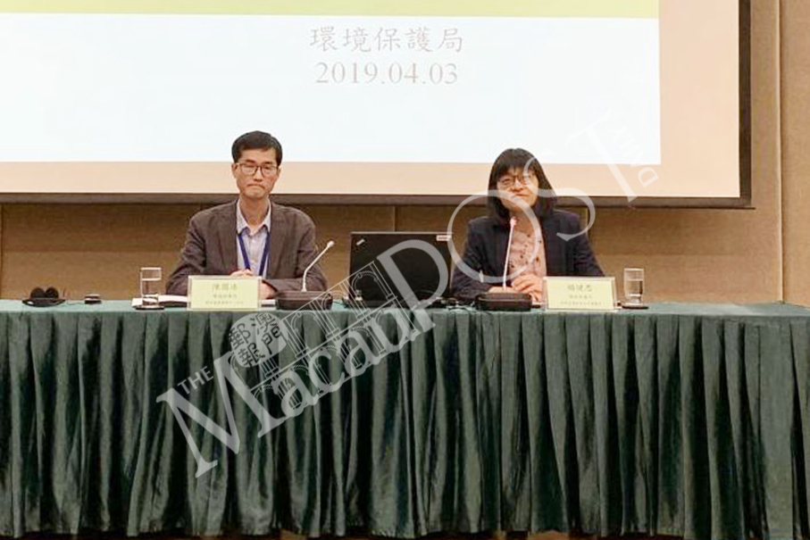 The Environmental Protection Bureau’s (DSPA) Environmental Infrastructures Management Centre Director Chan Kwok Ho (left) and Ieong Kin Si, who heads the bureau’s Awareness Promotion, Education and Cooperation Department, address yesterday’s press conference at the CEM Headquarters about the bureau’s new measures to reduce waste generation. Courtesy: TDM