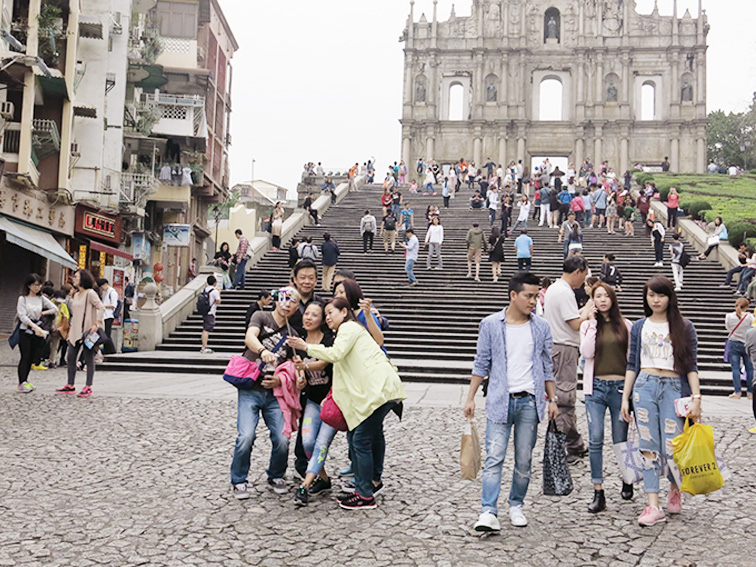 Visitors take a selfie in front of the UNESCO World Heritage-listed Ruins of Saint Paul’s Church yesterday. The Public Security Police (PSP) said in a statement yesterday that the number of visitor arrivals recorded during the three-day Ching Ming Festival stood at 450,958, an increase of 6.5 percent compared with the same holiday period of last year. The festival – also known as Tomb-Sweeping Day, ended on Monday. Photo: Ian Sio Tou