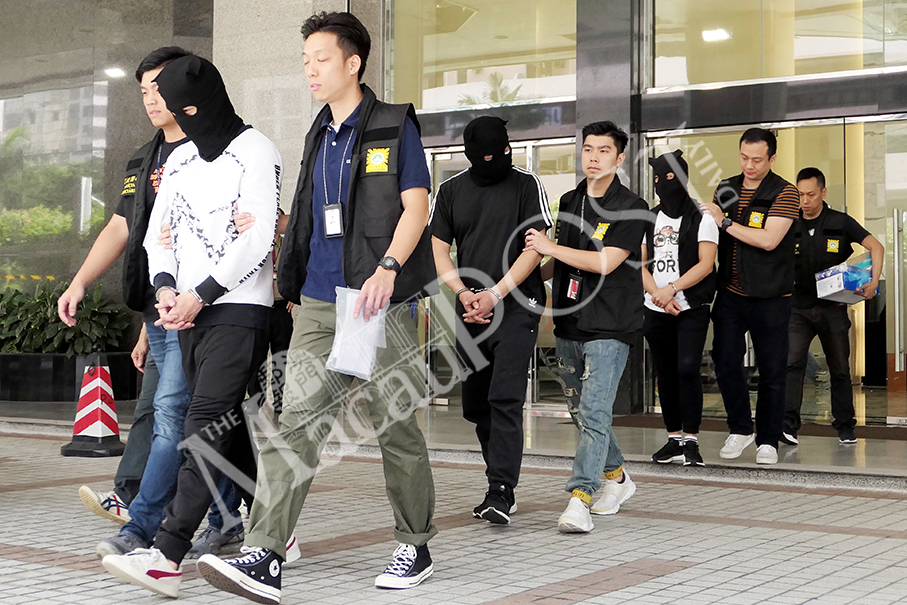PJ officers escort the three hooded fraud suspects to a PJ vehicle outside the PJ headquarters yesterday. Photos: Iong Tat Choi