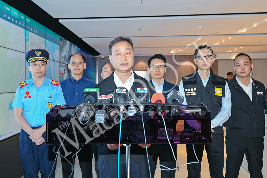 Accompanied by senior officials under the government’s civil protection structure, Unitary Police Service (SPU) Commissioner-General Ma Io Kun (front), who coordinates the city’s civil protection work, briefs reporters at the Civil Protection Operations Centre in Pac On in Taipa about Saturday’s “Crystal Fish” typhoon drill. Photo: GCS