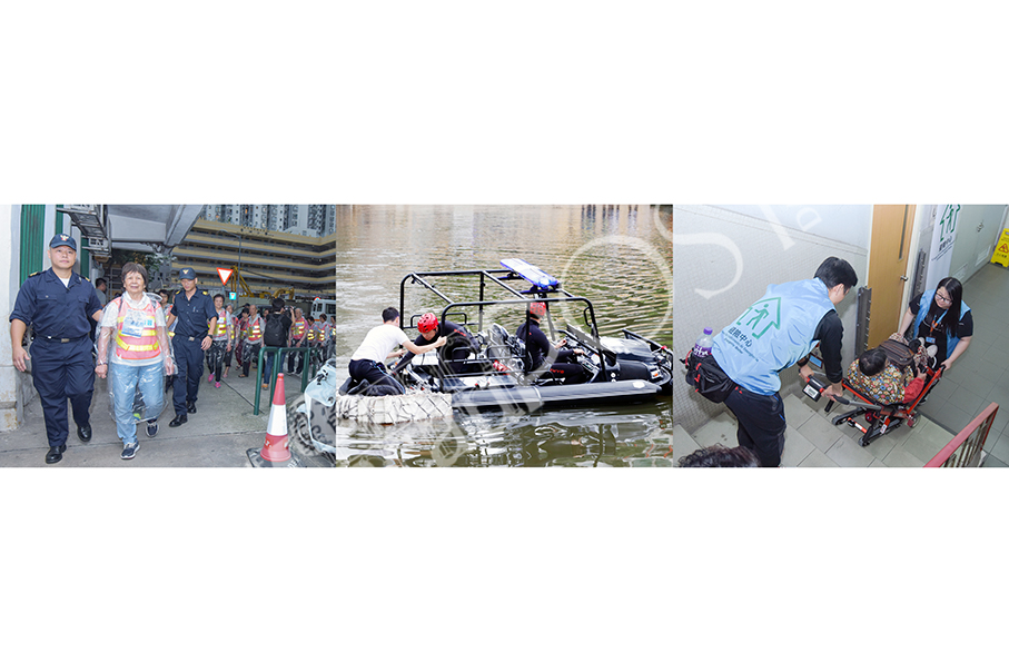 The three photos provided by the Government Information Bureau (GCS) on Saturday show different aspects of this year’s “Crystal Fish” drill, such as participants being “evacuated” to an emergency shelter in Ilha Verde, customs officers “rescuing a man” from a simulated flooded area outside the Macau Customs Service headquarters using a newly-bought vehicle which can travel both on land and water, and two government public servants helping a senior citizen “evacuate” to an emergency shelter at an unidentified location.