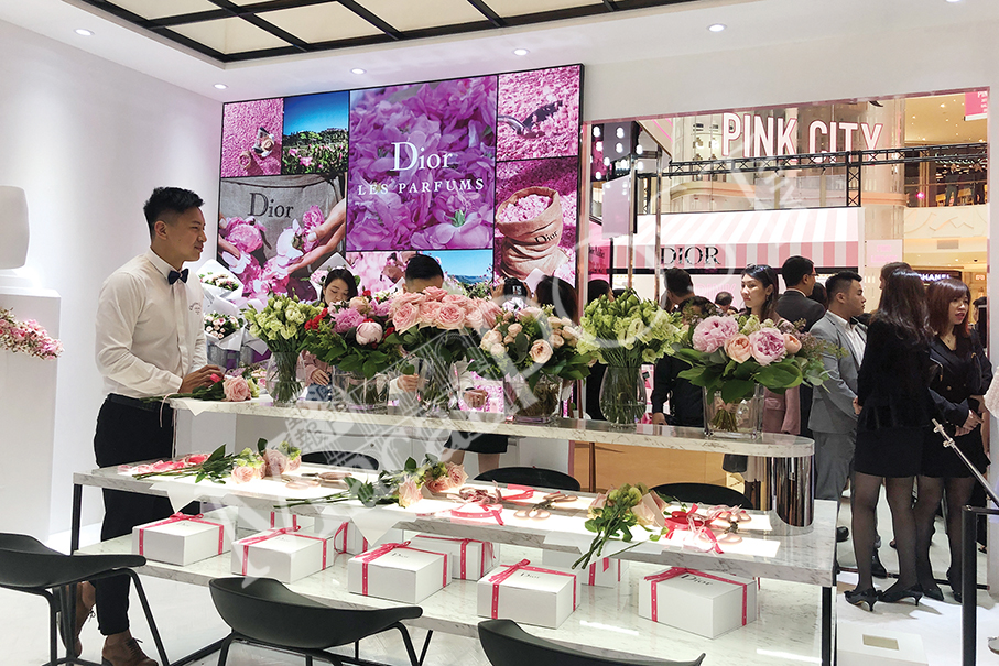 Staff at Dior Pink City’s flower shop prepares for the visitors to try bouquet wrapping at the pop-up store yesterday. Photo: Monica Leong