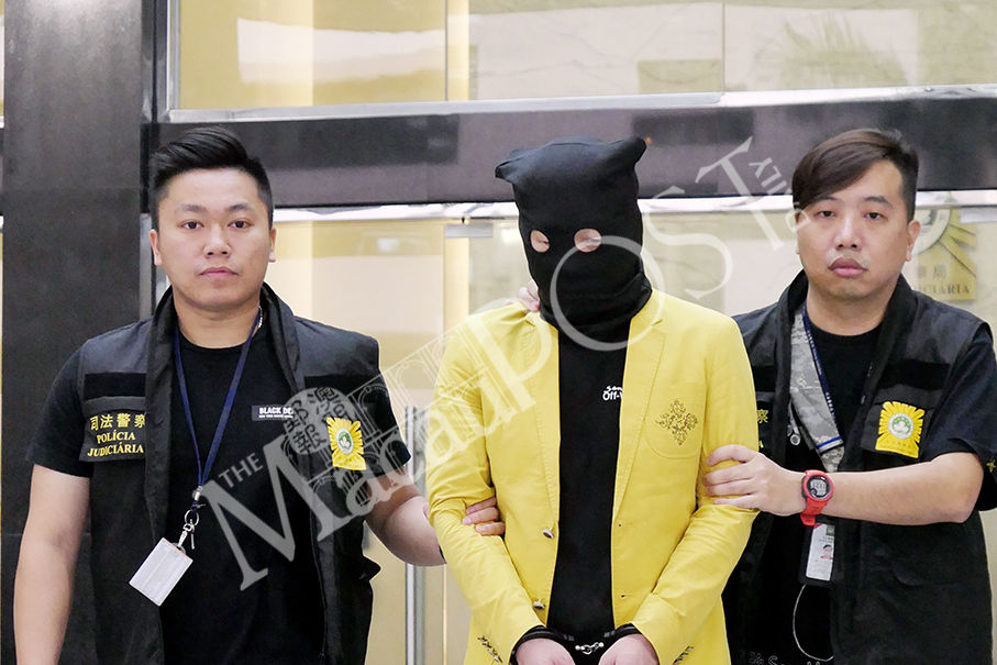 Judiciary Police (PJ) officers escort the suspect from the PJ headquarters to a vehicle on Saturday. Photo: Iong Tat Choi
