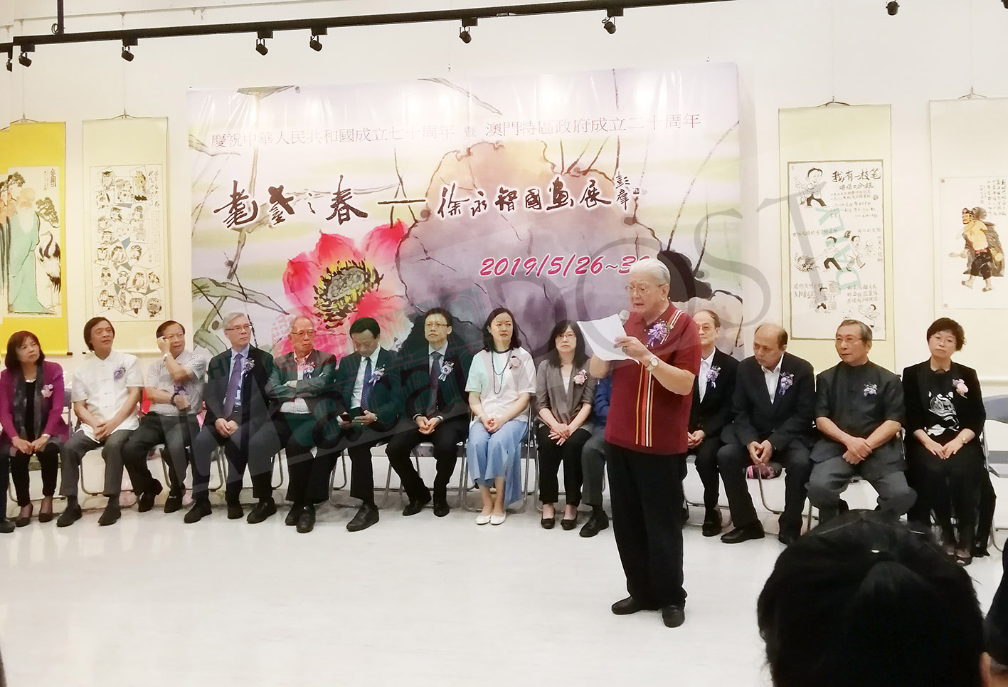 Choi Weng Chi (standing, front) addresses Sunday’s opening ceremony of his exhibition. Photo: Simon Wang