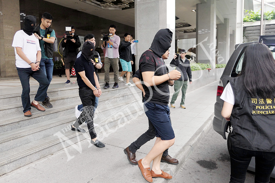 PJ officers escort the three hooded suspects of the counterfeit gold necklace case to a PJ vehicle outside the PJ headquarters yesterday. Photos: Iong Tat Choi