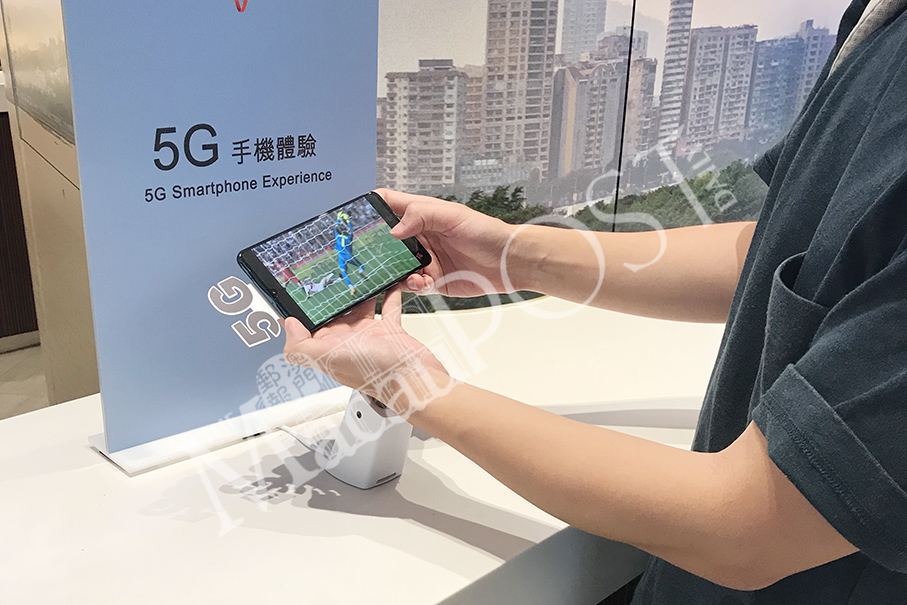 A journalist is watching a football match via a smartphone in the CTM Taipa Shop’s 5G experience zone.