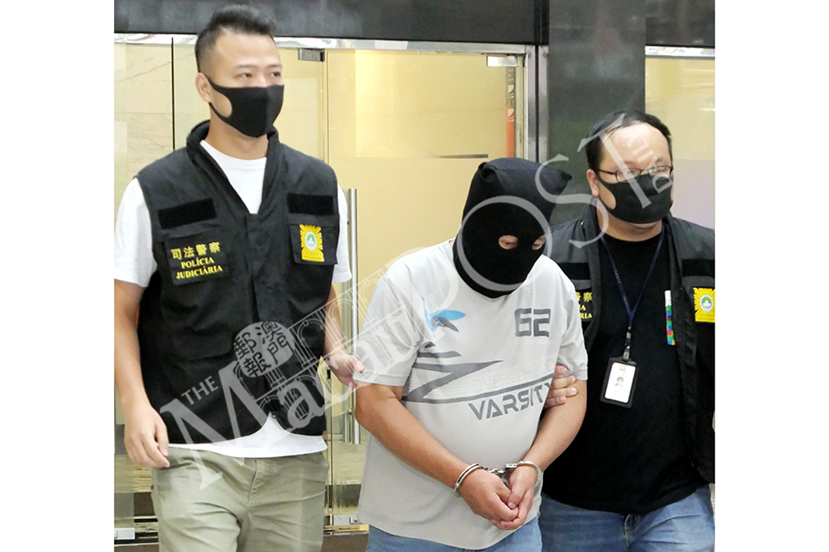 Judiciary Police (PJ) officers escort the hooded drug-trafficking suspect from Hong Kong to a PJ vehicle outside the PJ headquarters yesterday. Photo: Iong Tat Choi