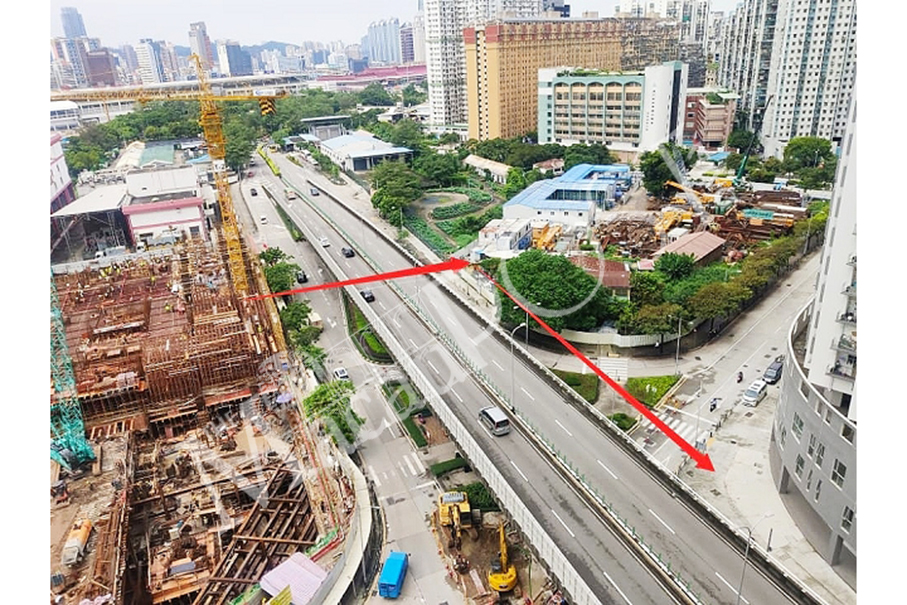This undated image taken from the Infrastructure Development Office’s (GDI) website yesterday indicates the location of the future footbridge by red arrows, from the under-construction Qingmao border checkpoint first to the site where the city’s former vehicle-testing centre was located (indicated by the horizontal arrow), and then to the Ilha Verde Building public housing estate (indicated by the vertical arrow).