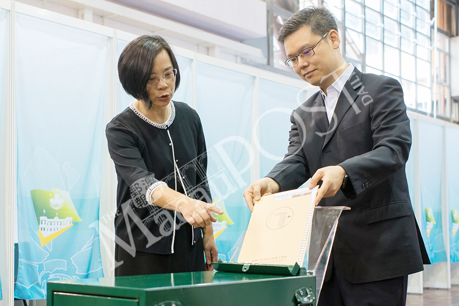 Chief Executive Electoral Affairs Commission President Song Man Lei (left) inspects the chief executive election voting procedure with an unidentified government official at the mock polling station for Sunday’s Chief Executive Election Committee at Macau Forum yesterday. Photo: GCS