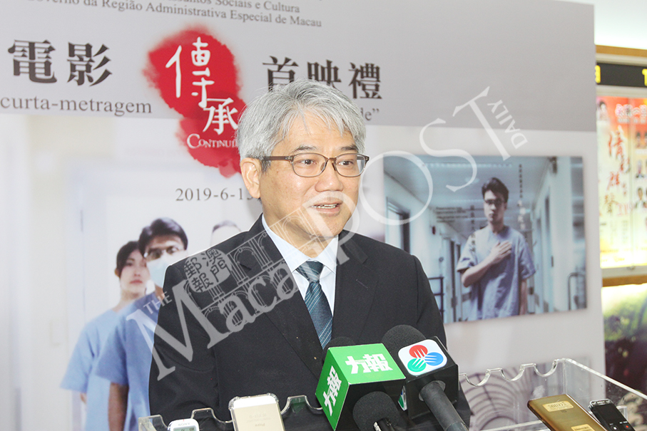 Health Bureau (SSM) Director Lei Chin Ion talks to reporters after yesterday’s short film première of “Continuity” at Cinema Alegria. Photo: Rachel Lei