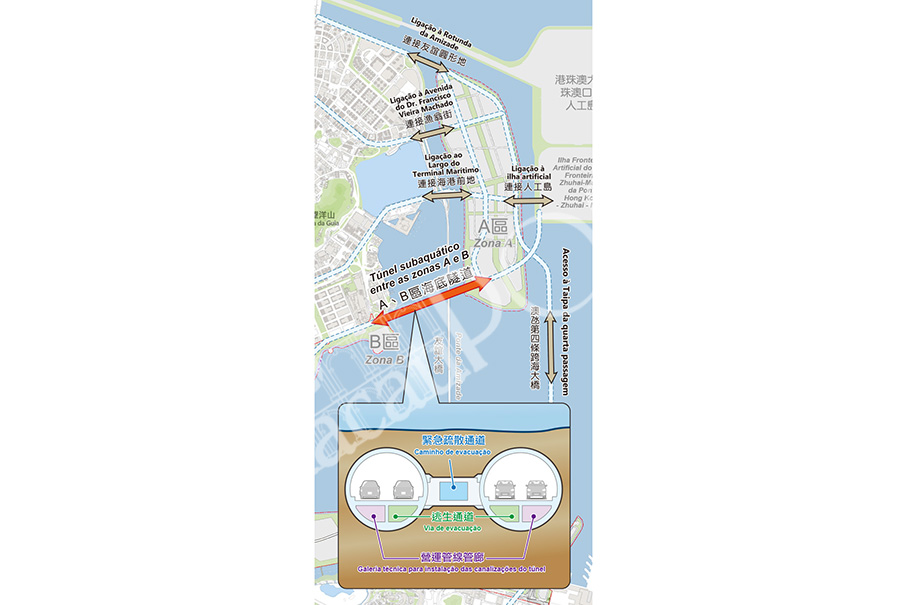 This picture provided by the Lands, Public Works and Transport Bureau (DSSOPT) yesterday shows the planned tunnel project (indicated by the red arrow) between Zone A and Zone B. The first arrow from the top indicates the existing link – the only one currently – between the peninsula and Zone A (at the peninsula’s Oriental Pearl roundabout). The second arrow from the top indicates the planned link from Zone A to Avenida do Dr. Francisco Vieira Machado and Rua dos Pescadores. The third arrow from the top on the left hand side indicates the planned link from Zone A to near the Outer Harbour Ferry Terminal. The horizontal arrow on the right-hand side indicates the existing link between Zone A and the man-made island for the Macau checkpoint of the Hong Kong-Zhuhai-Macau Bridge (HZMB). The vertical arrow indicates the planned Macau-Taipa fourth link.