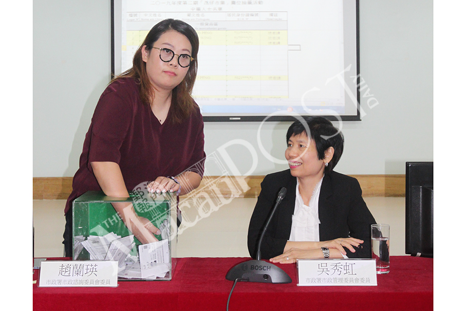 Municipal Affairs Bureau (IAM) Consultative Committee member Chio Lan Ieng (left) draws yesterday’s 18 winners as IAM Administrative Committee member Ung Sau Hong looks on, in the IAM Inspection and Health Department Hall at Fortune Tower. Photo: Rachel Lei