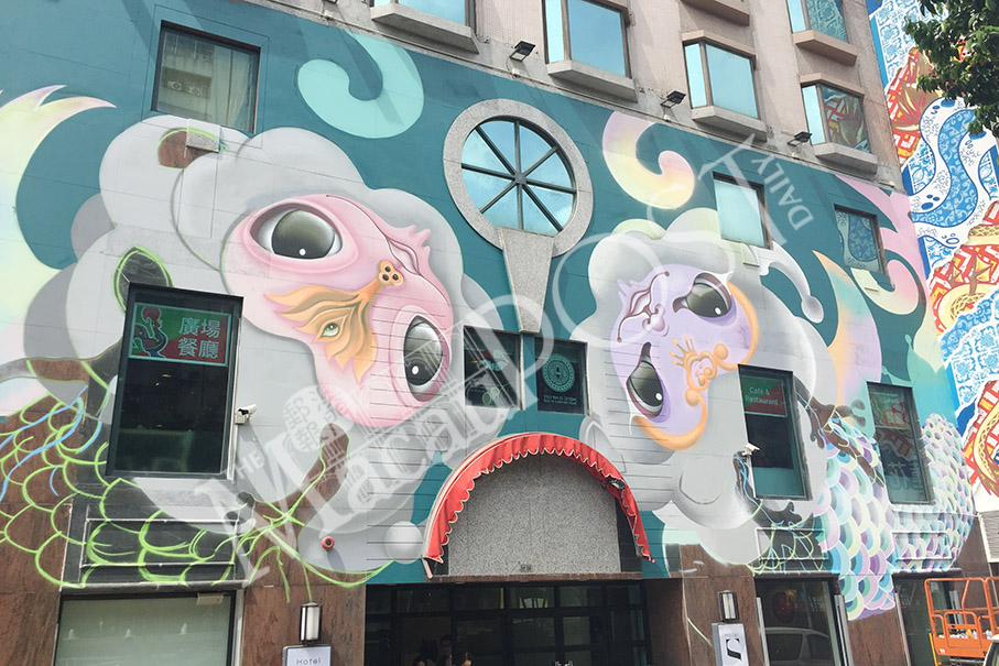 The graffiti walls designed by Rainbo and Uncle show two fish chasing after the rounded window resembling a sea pearl.