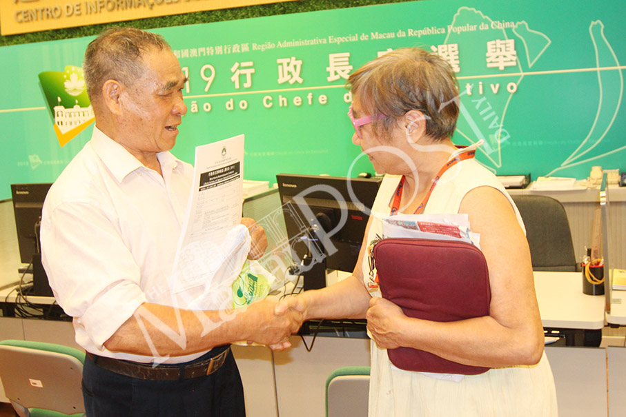 Unemployed local citizen Lei Oi Chi (right) obtains her nomination forms from an official yesterday.