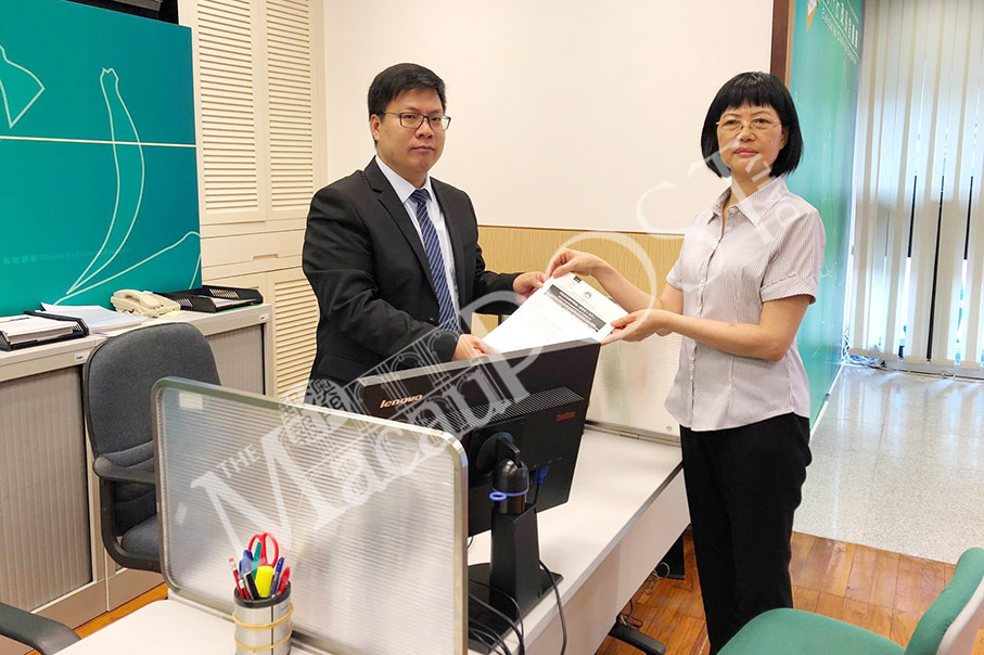 Former Legislative Assembly president Ho Iat Seng (left) receives his nomination forms from an official at the Public Administration Building in Rua do Campo yesterday. Photo: Rachel Lei