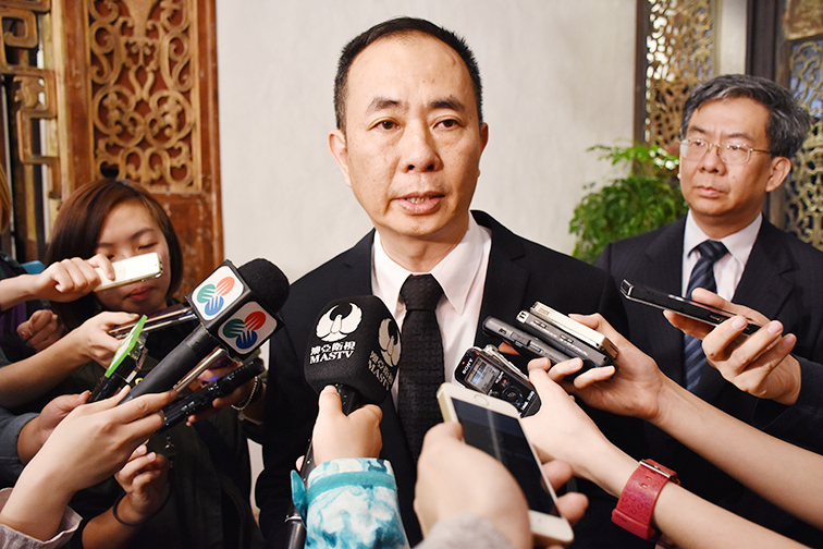 Cultural Affairs Bureau (IC) President Guilherme Ung Vai Meng (centre) speaks to reporters after a signing ceremony at the UNESCO World Heritage-listed Mandarin House yesterday, as IC Vice-President Leong Hio Ming (right) looks on. Photo: Leong Lok Ian