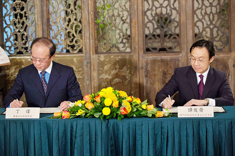 Deputy Minister of Culture Ding Wei (left) and Secretary for Social Affairs and Culture Alexis Tam Chon Weng sign an implementation plan for cultural exchanges and co-operation between Macau and the mainland in 2016-18, at the UNESCO World Heritage-listed Mandarin House yesterday. A delegation of the ministry headed by Ding arrived for a three-day fact-finding visit on Tuesday. The implementation plan is based on a cultural co-operation arrangement signed between the two sides in 2006. – Xinhua