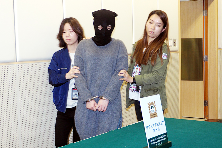 Judiciary Police (PJ) officers escort the hooded and handcuffed child abuse suspect into a pressroom at the PJ headquarters in Zape before a special press conference about the case yesterday. Photo: Iong Tat Choi