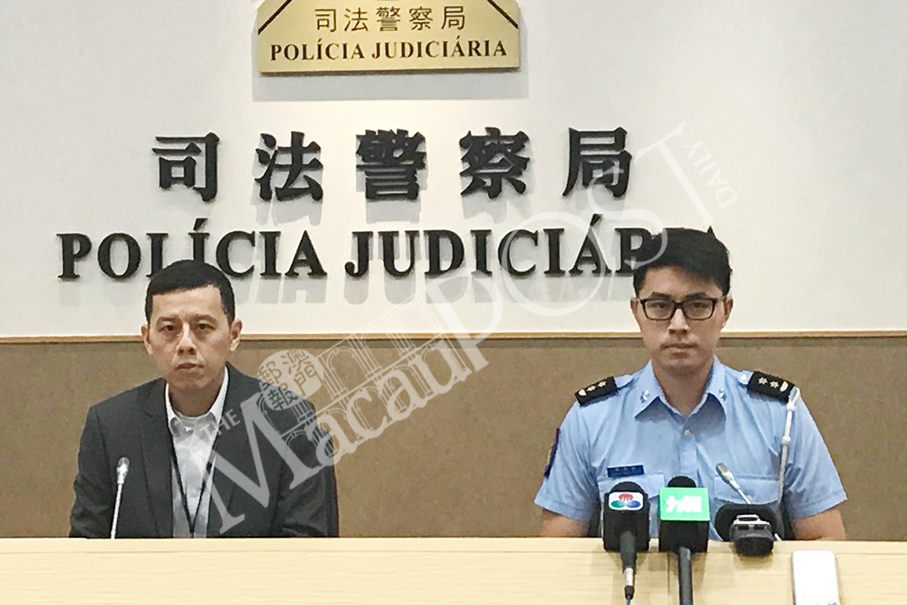 Judiciary Police (PJ) spokesman Chan Wun Man (left) and Public Security Police (PSP) spokesman Wong Wai Chon attend yesterday’s regular press conference by Macau’s two police forces. Photo: Rachel Lei