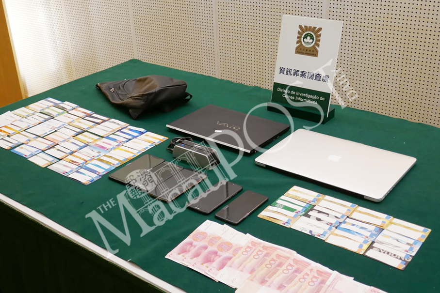 This handout photo released by the Judiciary Police (PJ) on Friday shows evidence seized from the two suspects – two laptops, a card reader, a number of fake bank cards, and cash.