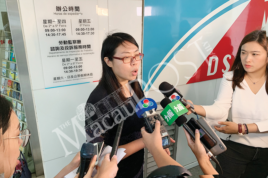 Legislator Lei Cheng I talks to reporters outside the Labour Affairs Bureau (DSAL) yesterday. Photo: Prisca Tang