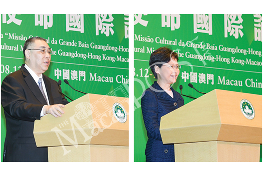 Macau Chief Executive Fernando Chui Sai On (left) and his Hong Kong counterpart Carrie Lam Cheng Yuet-ngor deliver their opening speeches at the International Forum on the “Cultural Mission of the Guangdong-Hong Kong-Macau Greater Bay Area” at the Hyatt Hotel in Cotai yesterday. Photos: GCS