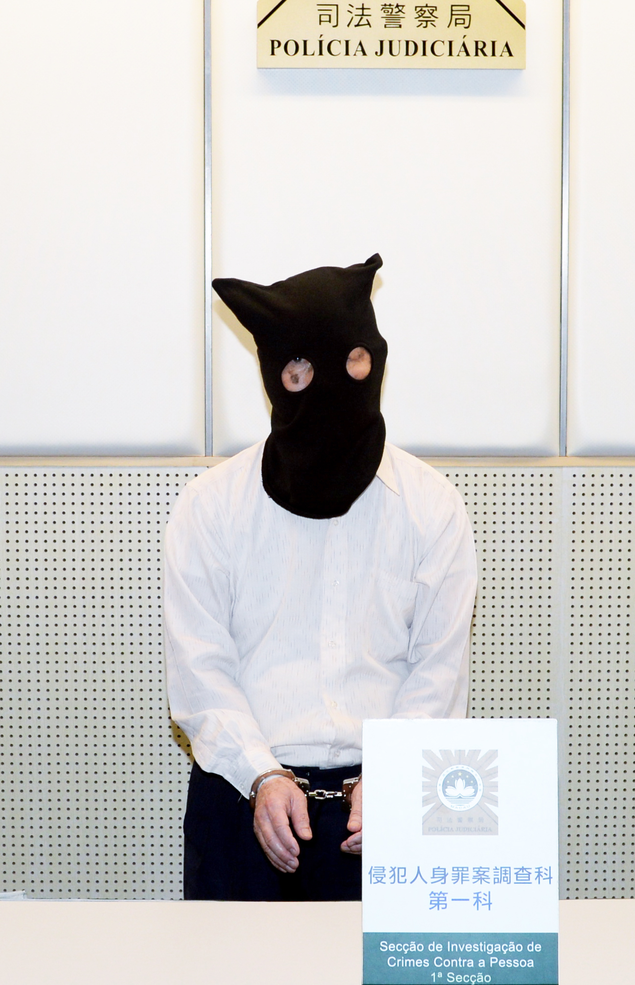 This handout photo provided by the Judiciary Police (PJ) showed the hooded 80-year-old suspect posing in a press room at the PJ headquarters.