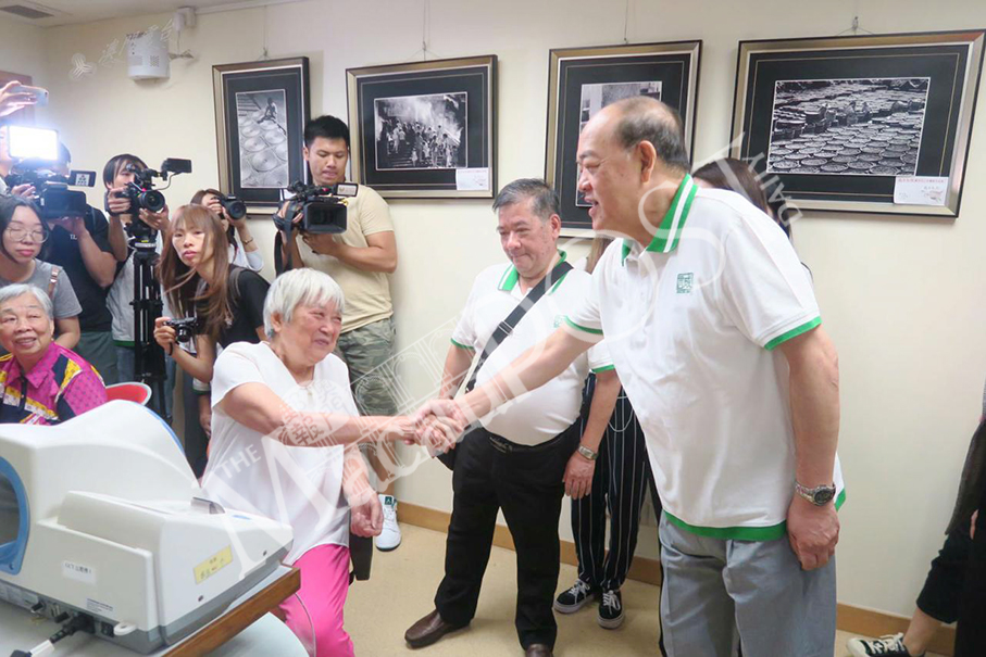 Chief executive candidate Ho Iat Seng shakes hands with a senior citizen during yesterday’s visit to the Macau Women’s General Association’s Integrated Services Building in San Kio district. Courtesy: TDM