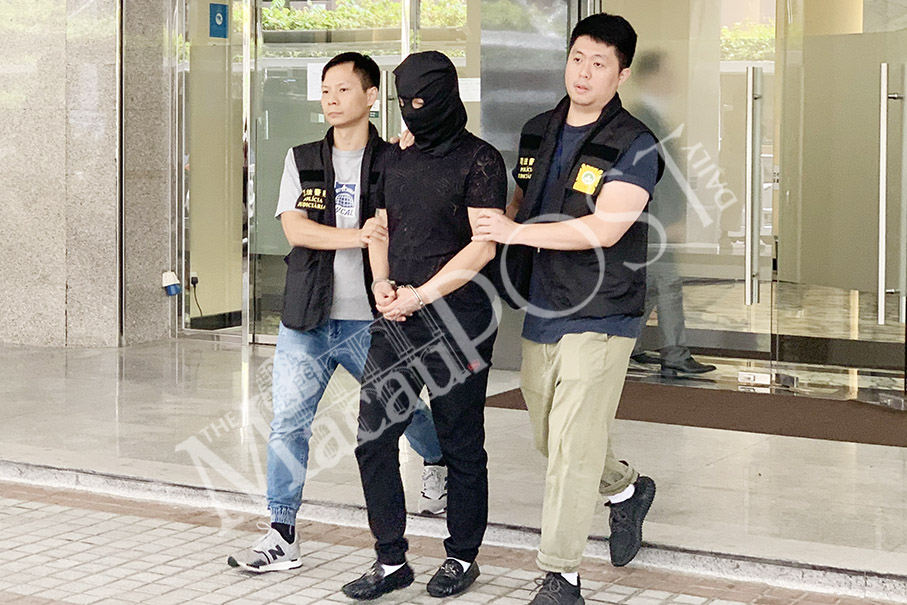 Judiciary Police (PJ) officers escort the hooded burglary suspect to a PJ vehicle outside the PJ headquarters in Zape yesterday. Photo: Dorothy Vong