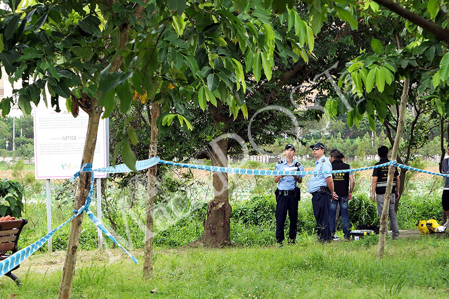 Public Security Police (PSP) officers cordon off the reed bed near the Taipa Houses Museum – where the human skeleton was found yesterday. Photo: Iong Tat Choi