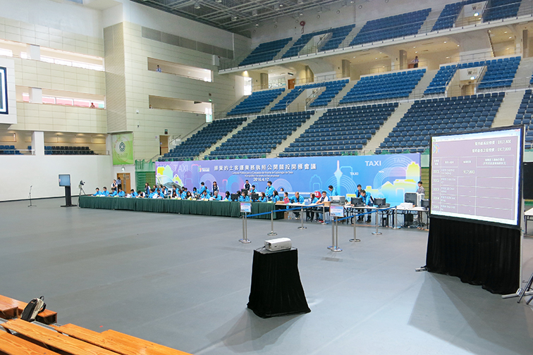 Members of a committee chaired by Transport Bureau (DSAT) Vice Director Chiang Ngoc Vai unseal and screen taxi operator licence bids at Macau Polytechnic Institute’s Sports Stadium yesterday.