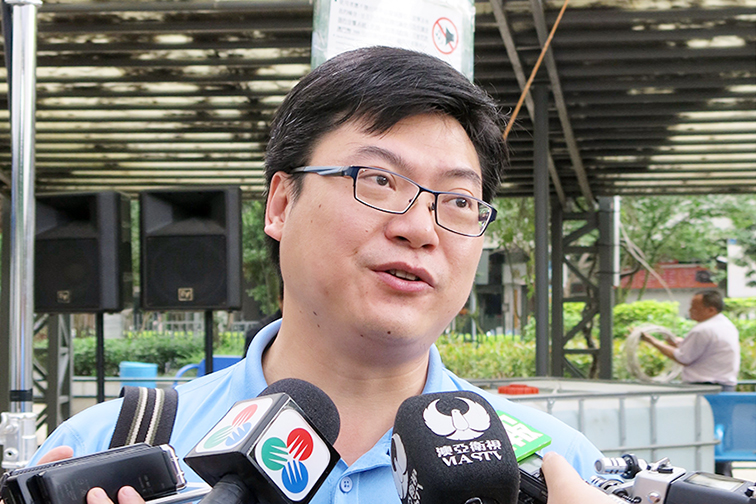 Local lawyer Ho Kam Meng, a guest speaker at yesterday’s Macau Forum hosted by TDM, talks to reporters in Areia Preta Park after the open-air debate. Photos: Ian Sio Tou