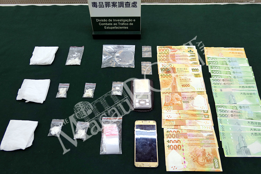 Cocaine, cash, a mobile phone and other evidence seized by the police from the 16-year-old suspect and his hotel guestroom on Tuesday are displayed in a pressroom at the Judiciary Police (PJ) headquarters yesterday.