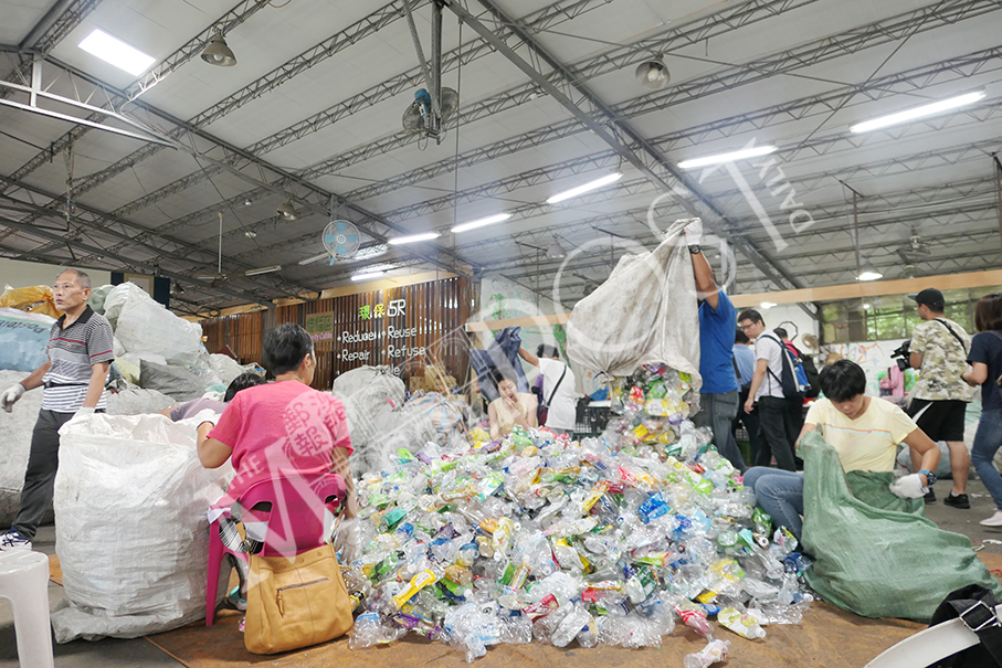 Local volunteers help sort plastic bottles at the Tzu Chi Recycling and Educational Centre in Neihu, Taipei, yesterday. Photos: Monica Leong