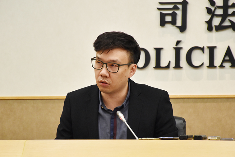 Judiciary Police (PJ) spokesman Tam Weng Keong speaks during yesterday’s press briefing in a pressroom at the PJ headquarters in Zape. Photo: Leong Lok Ian