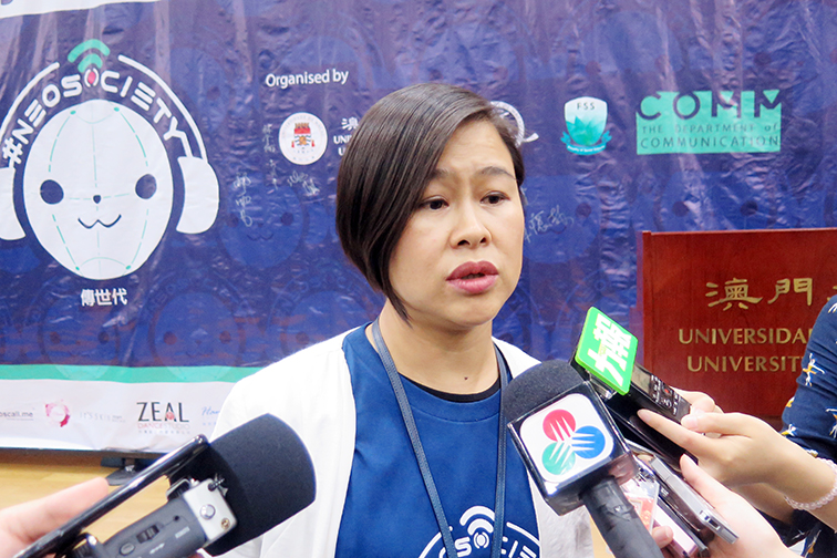 Agnes Lam Iok Fong, assistant dean of the University of Macau’s (UM) Faculty of Social Sciences, talks to reporters after the opening ceremony of the ‘UM CommFest 2016’ campaign on the UM campus in Hengqin. Photo: Davis Ip