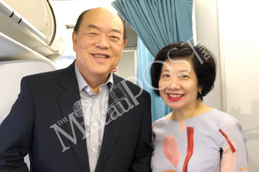Chief Executive-designate Ho Iat Seng (left) and his wife Cheng Soo Ching pose for a photo during their Air Macau return flight to the city yesterday after their three-day trip to Beijing. Photo: Maria Cheang Ut Meng