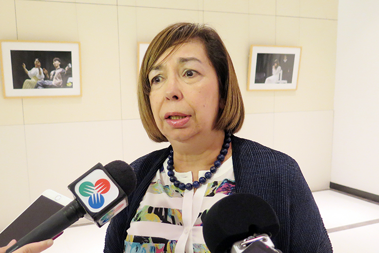 Fernanda Gil Costa, who heads the University of Macau’s (UM) Department of Portuguese, talks to reporters on the sidelines of ‘The Portuguese Language Day’ hosted by her department on the UM campus in Hengqin yesterday. Photo: Davis Ip