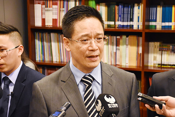 Public Prosecutor-General Ip Son Sang speaks to reporters after yesterday’s working meeting with his Portuguese counterpart.