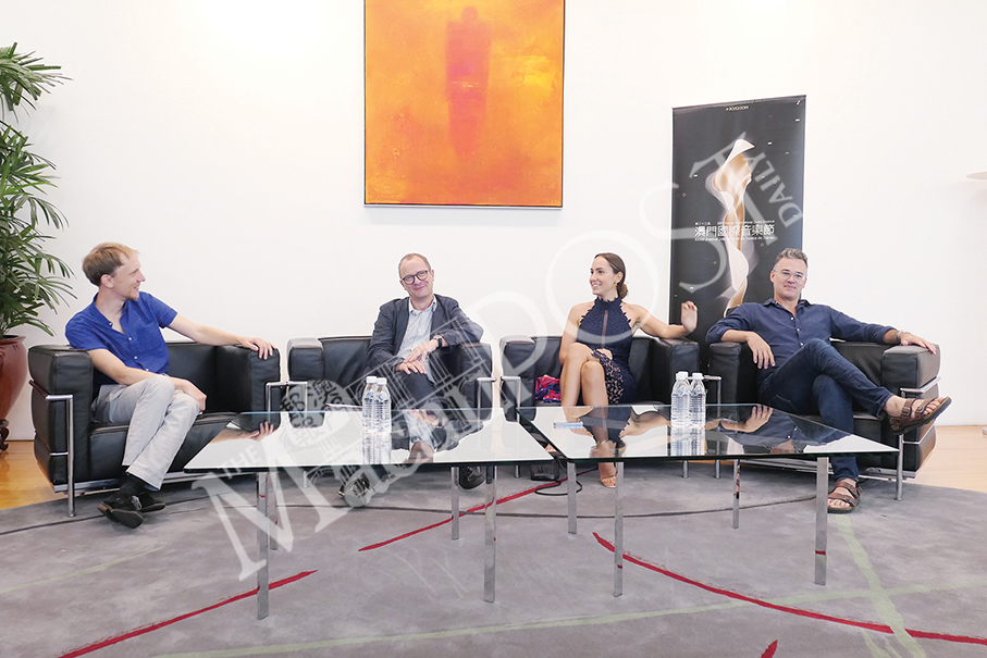 (From left to right) Komische Oper Berlin’s Associate Director Tobias Ribitzki, Opera Director Philip Bröking, soprano Kim-Lilian Strebel and tenor Adrian Strooper react during yesterday’s meet-the-press session at Macau Cultural Centre. Photo: Monica Leong