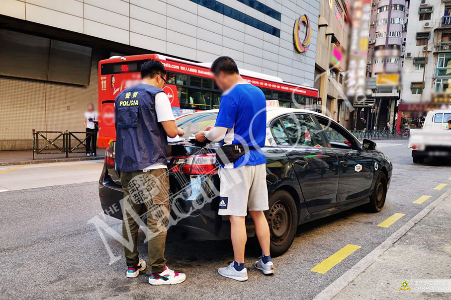 This undated handout photo provided by the Public Security Police (PSP) yesterday shows a PSP officer fining a cabbie in Rua de Cantão in Zape.