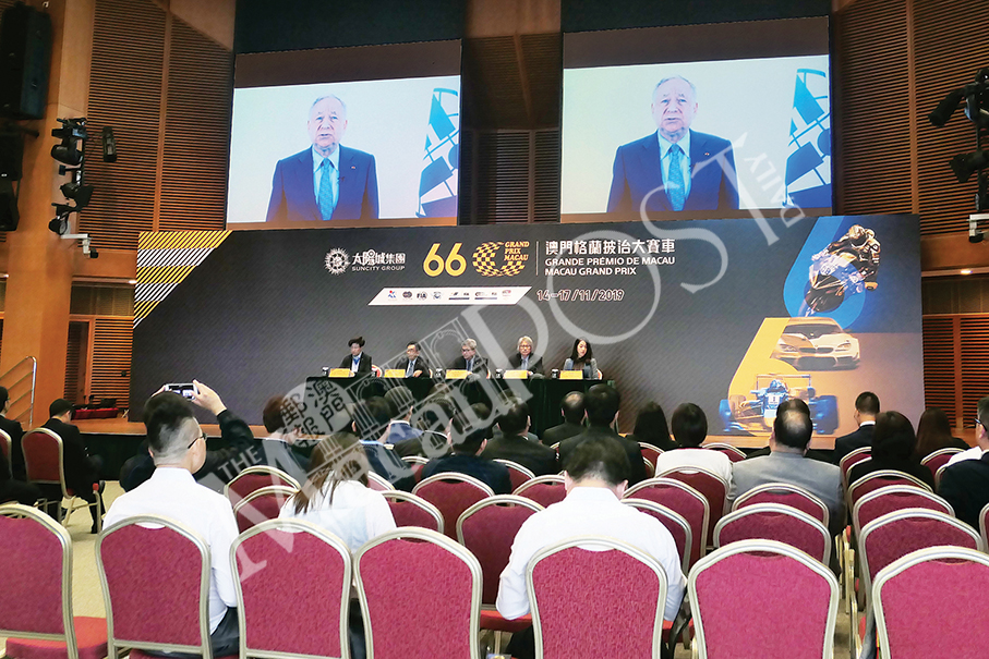A prerecorded video of FIA President Jean Todt delivering a message is shown during yesterday’s Macau Grand Prix press conference held at the Macau Science Centre. Photo: Monica Leong