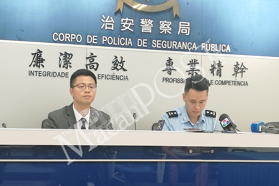 Judiciary Police (PJ) spokesman Leng Kam Lon (left) listens to reporters’ questions during yesterday’s regular press conference while Public Security Police (PSP) spokesman Choi Iok Kin looks on. Photo: Kristy Chan