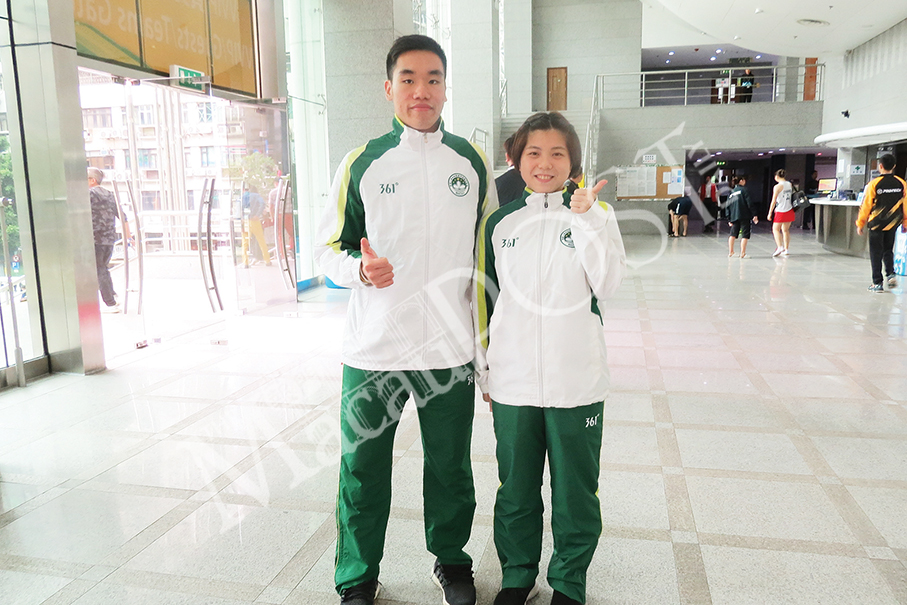 Mixed doubles players Leong Iok Chong (left) and Ng Weng Chi pose in the lobby of Tap Seac Multi Sports Pavilion on Wednesday.