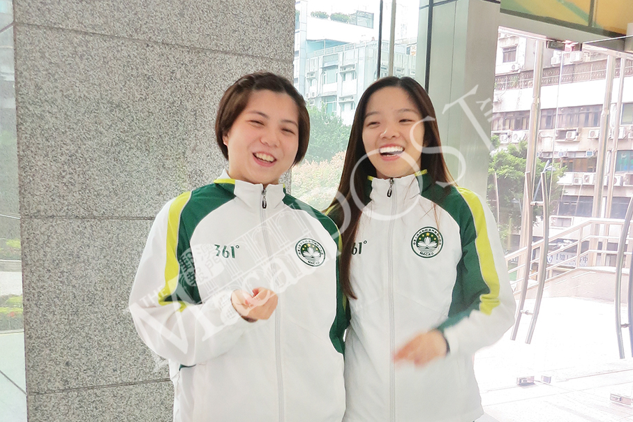 Ladies doubles players Ng Weng Chi (left) and Gong Xue Xin pose in the lobby of Tap Seac Multi Sports Pavilion on Wednesday.