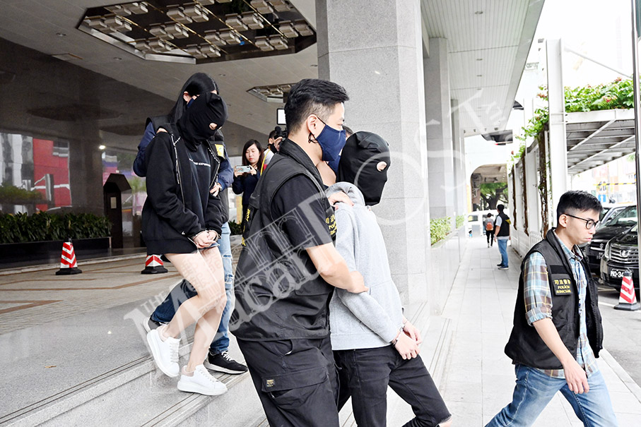 Judiciary Police (PJ) officers escort the two hooded drug-trafficking suspects from Hong Kong to a PJ vehicle outside the PJ headquarters in Zape yesterday Photo: Iong Tat Choi